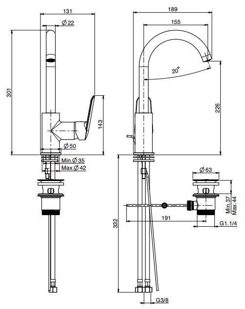 • с двумя гибкими шлангами 370 мм