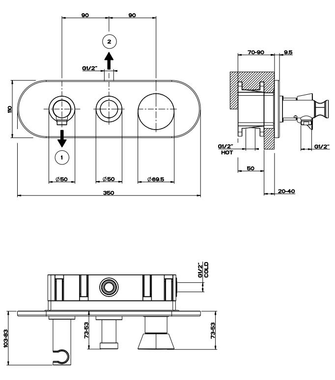 Gessi Cono Внешние части для встраиваемого однорычажного смесителя на 2 позиции с переключателем, подводом воды и держателем душевой лейки. Комплектуется с душевой лейкой арт. 45154 и шлангом 01637.