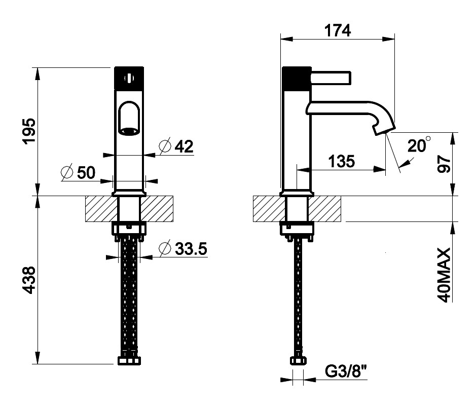 Смеситель для раковины, соединительные шланги на 3/8", без донного клапана.