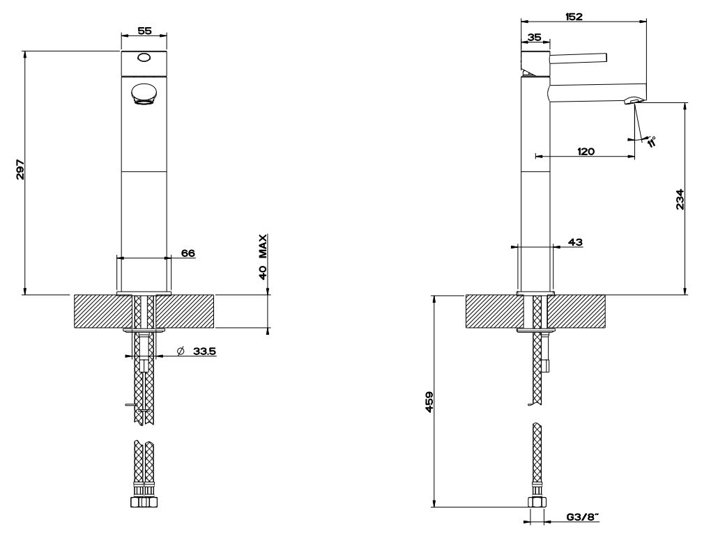 Gessi Ovale Смеситель для раковины высокий, соединительные шланги на 3/8", без донного клапана. Излив 120 мм.