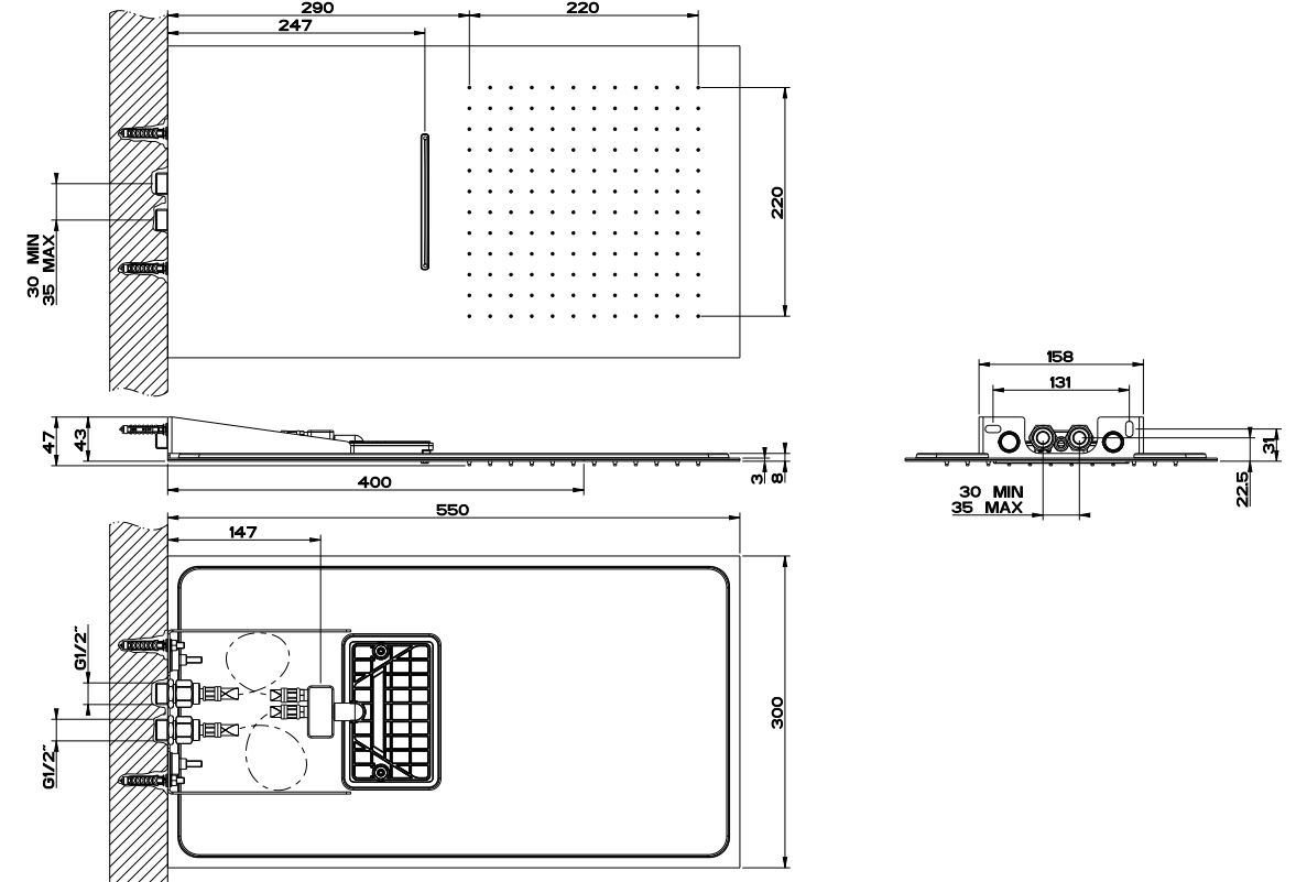Gessi Tremillimetri многофункциональная система с подачей дождь/каскад quadro 300 для 2-х позиционного переключателя (не входит в комплект) настенного крепления.