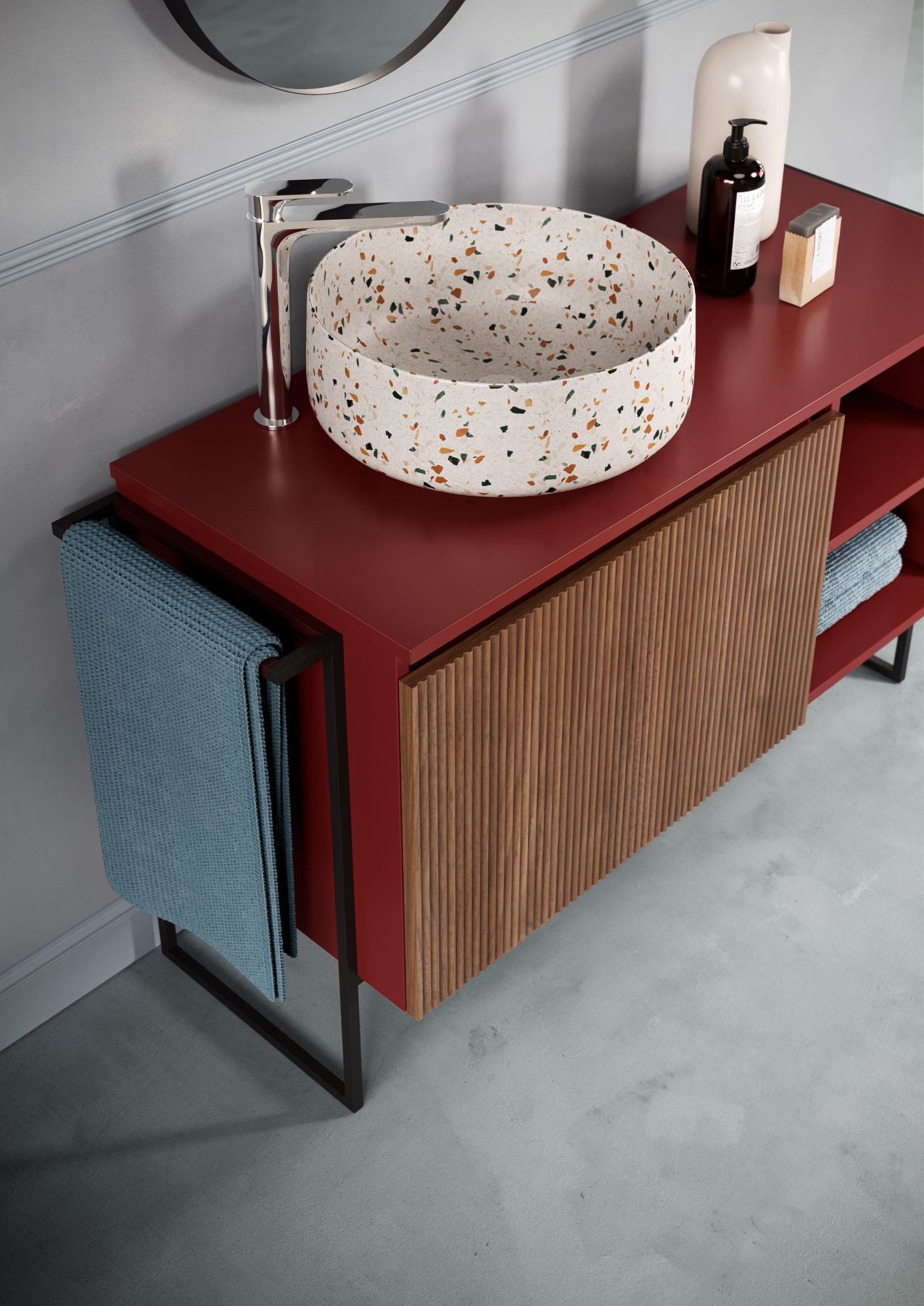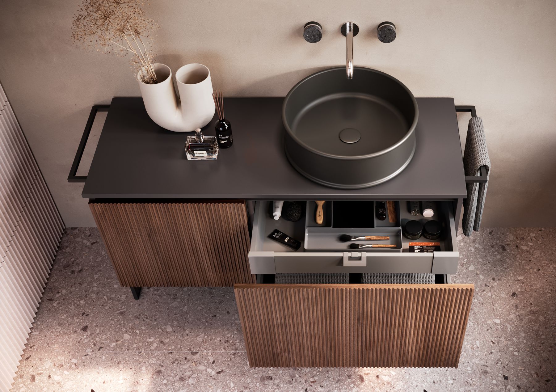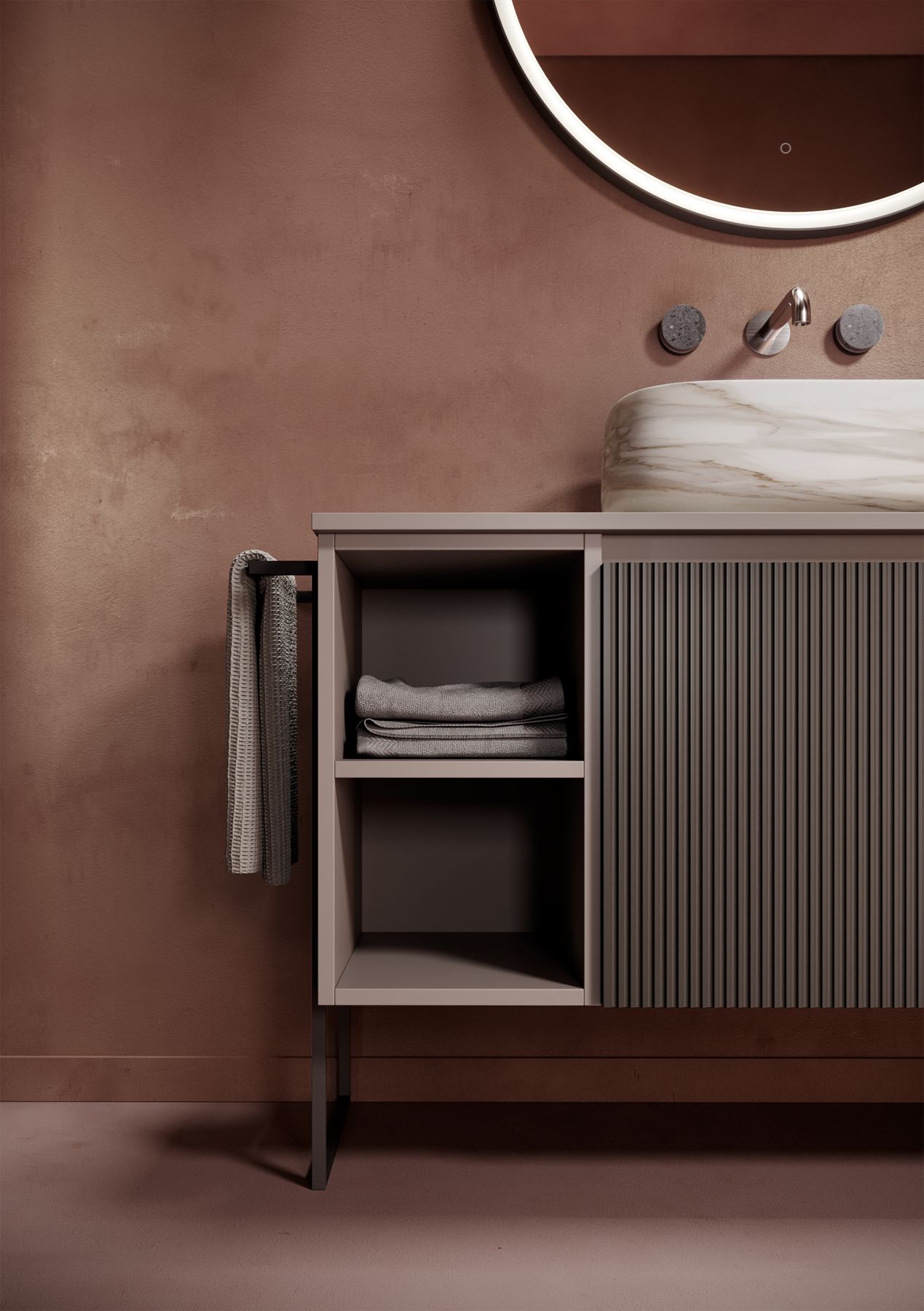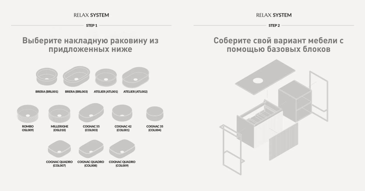 Relax — это гораздо больше, чем просто мебель для ванной. Разработанная и полностью произведенная в Италии, она идеально впишется в любой интерьер. Длина и отделка могут быть выбраны на этапе проектирования: однотонная или с дверцами в цвете светлого или тёмного ореха. На неё можно установить различные раковины-столешницы, а также выбрать расположение полок и ящиков. Единственная неизменная ценность — это вкус, элегантность и современный дизайн.