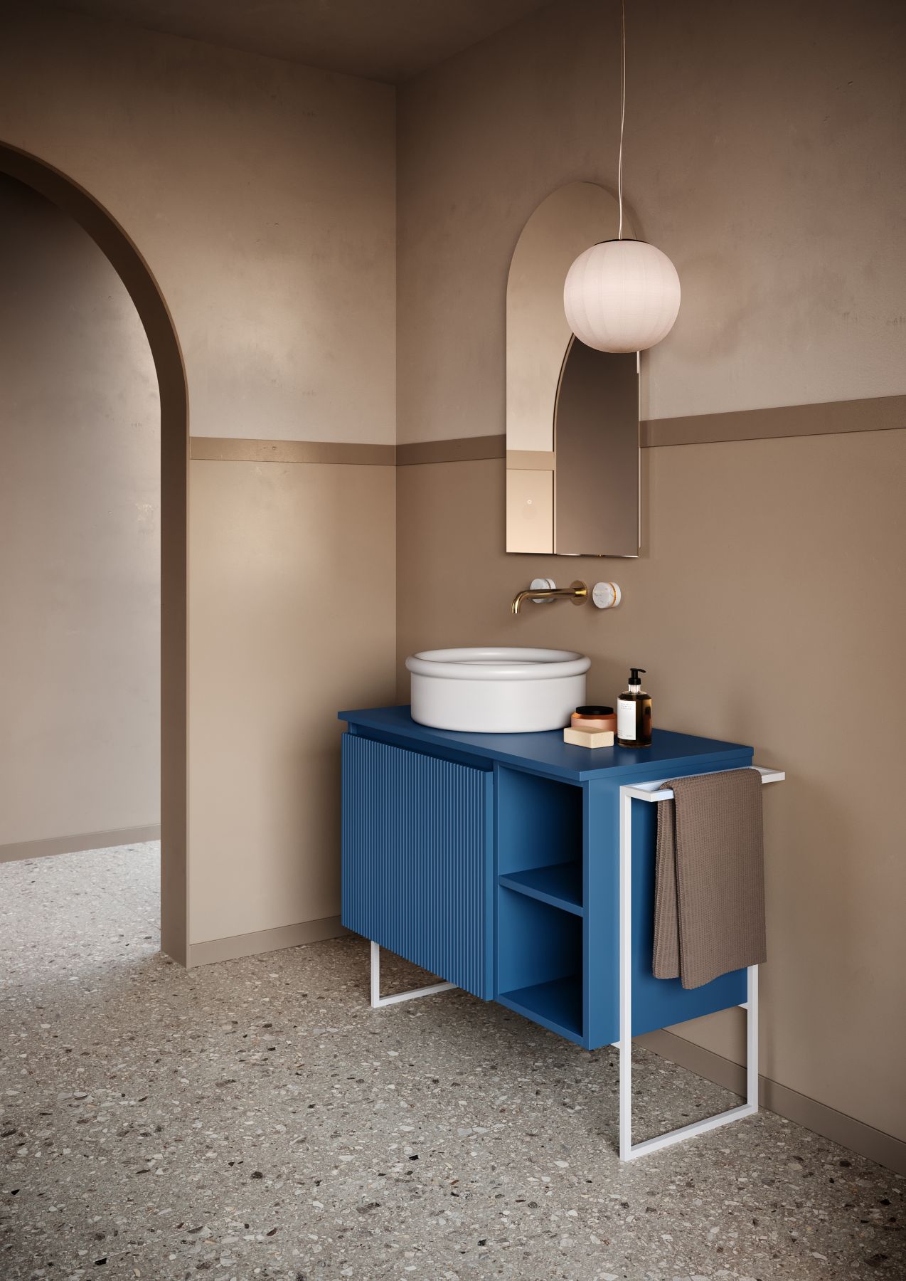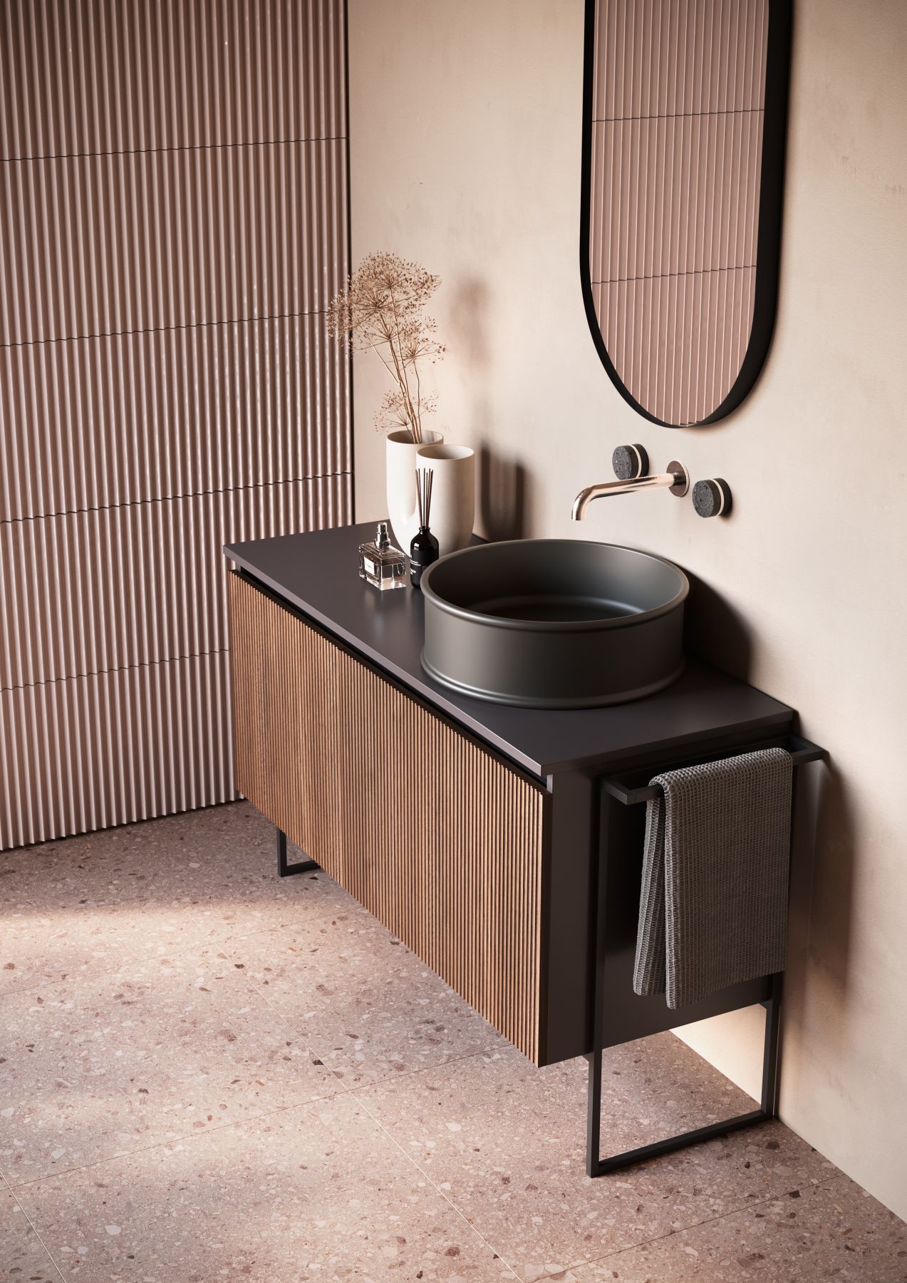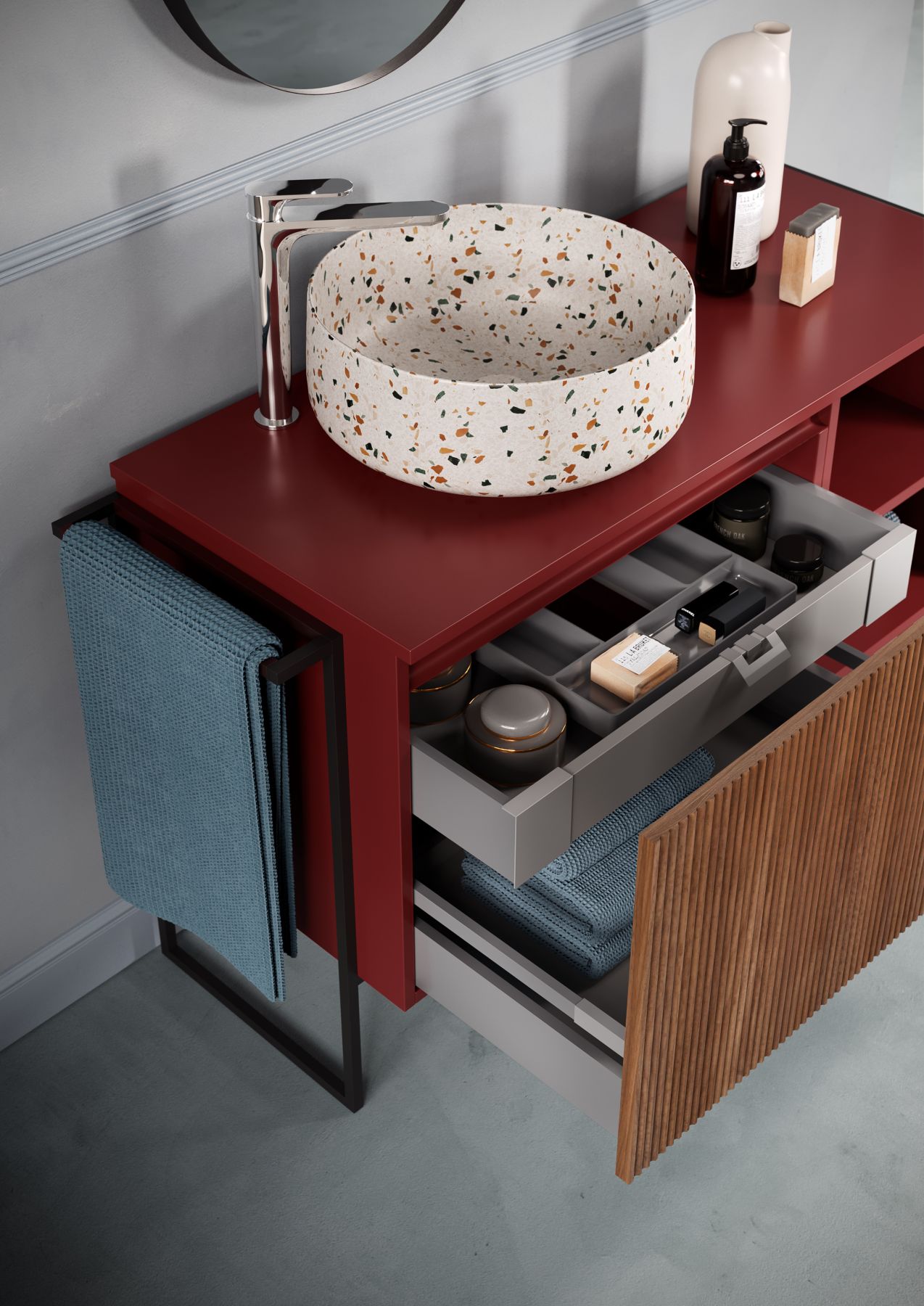 Relax — это гораздо больше, чем просто мебель для ванной. Разработанная и полностью произведенная в Италии, она идеально впишется в любой интерьер. Длина и отделка могут быть выбраны на этапе проектирования: однотонная или с дверцами в цвете светлого или тёмного ореха. На неё можно установить различные раковины-столешницы, а также выбрать расположение полок и ящиков. Единственная неизменная ценность — это вкус, элегантность и современный дизайн.