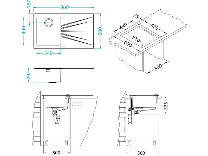 Мойка для кухни Alveus KARAT 10 правая в комплекте с сифоном 86х50 см