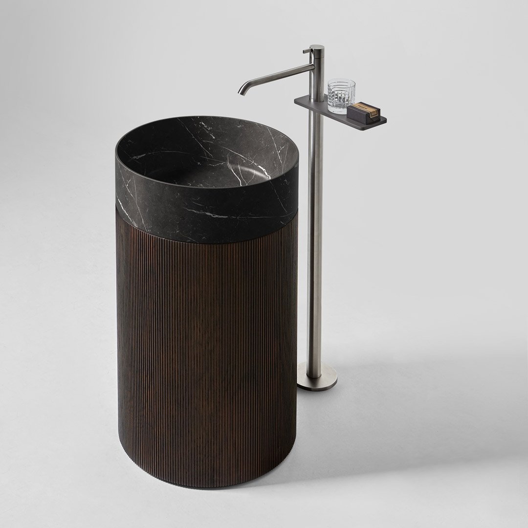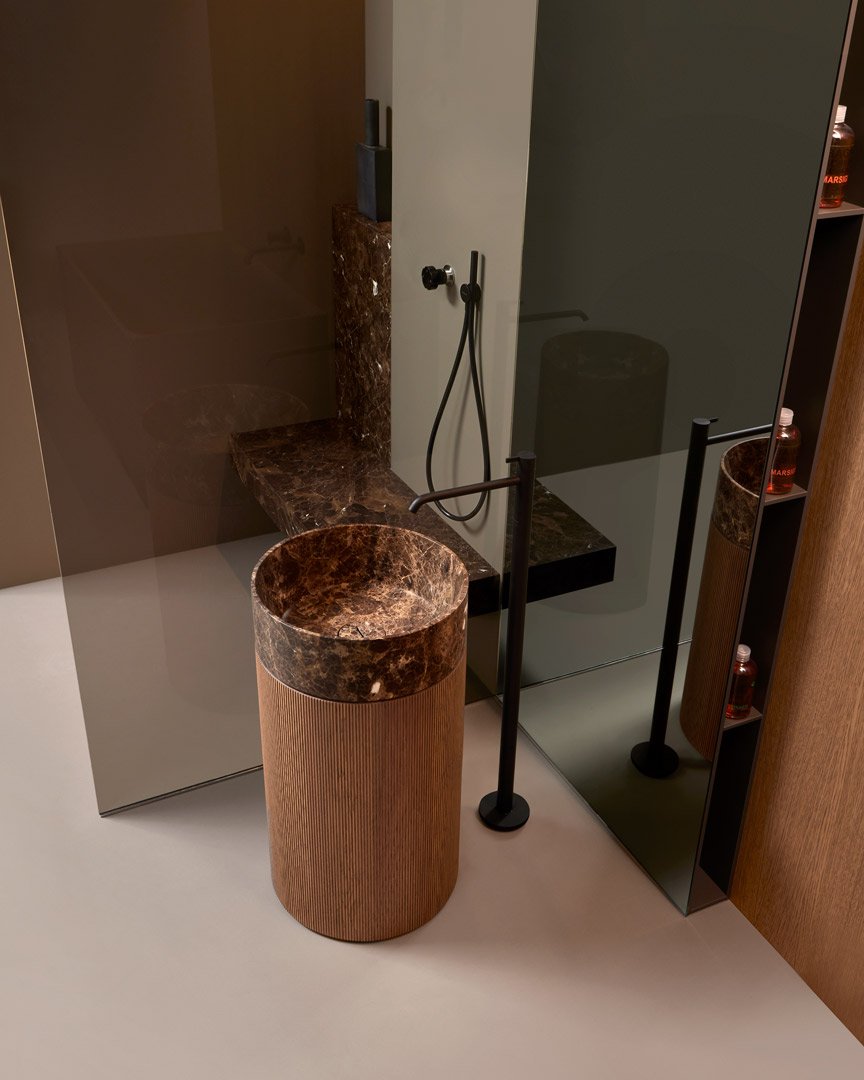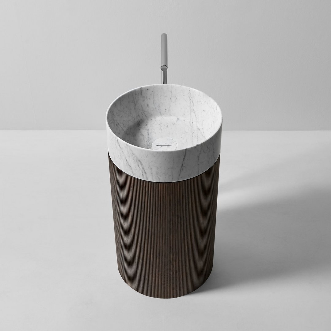 Раковина напольная с умывальником из камня и пьедесталом из дерева соответствии с раскладкой цветов. В комплетке с жесткой трубой слива в пол, самотечным донным клапаном, сифоном и гибкой подводкой. Примечание: стоимость за пьедестал в отделке Noce Canaletto, Noce Visone и Noce Canadese по запросу