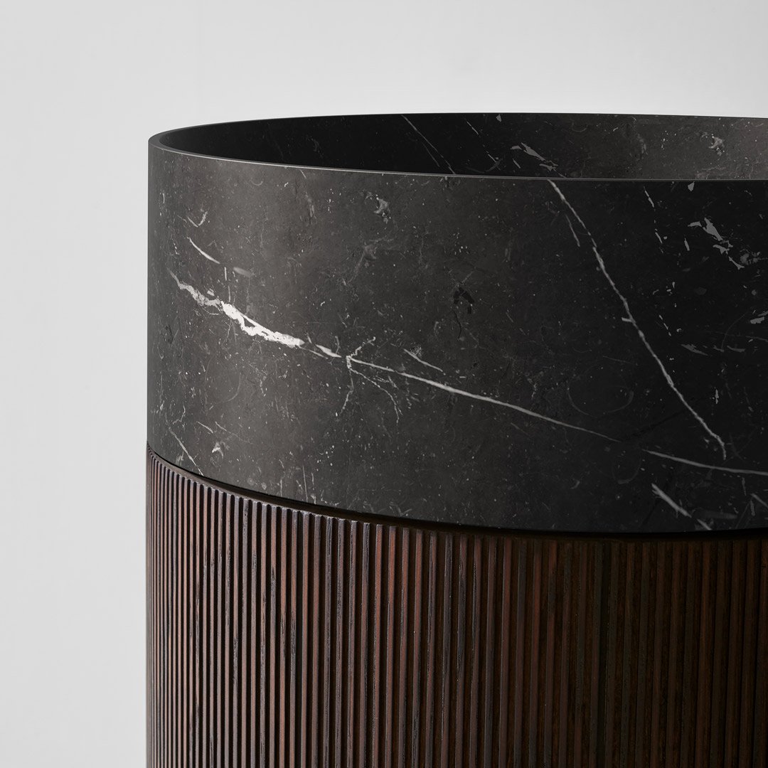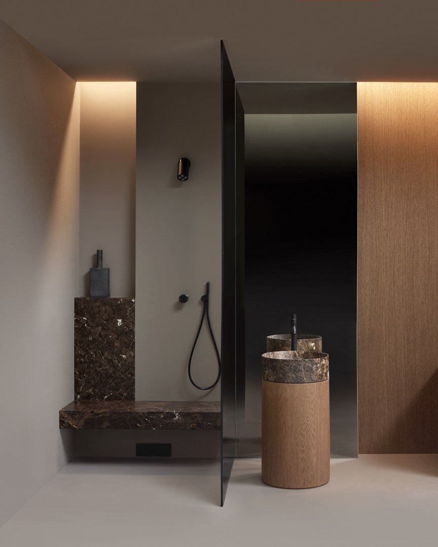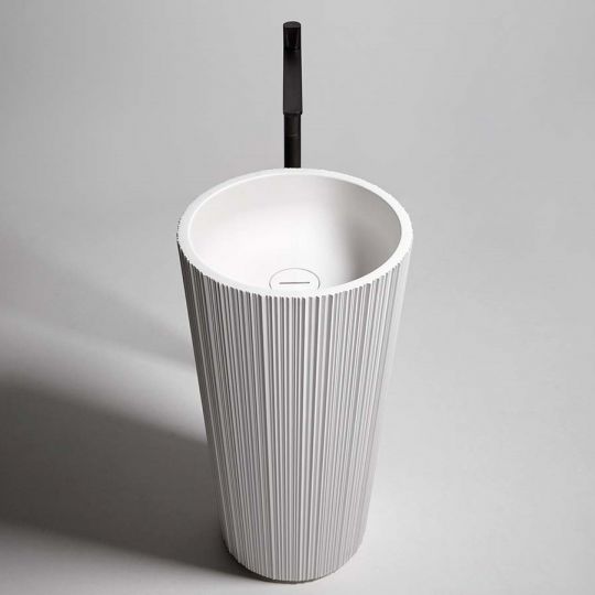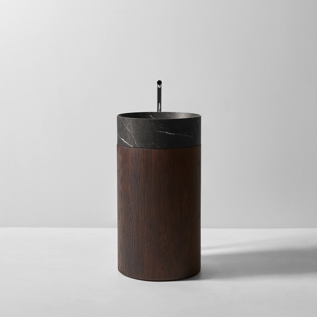 Раковина напольная с умывальником из камня и пьедесталом из дерева соответствии с раскладкой цветов. В комплетке с жесткой трубой слива в пол, самотечным донным клапаном, сифоном и гибкой подводкой. Примечание: стоимость за пьедестал в отделке Noce Canaletto, Noce Visone и Noce Canadese по запросу