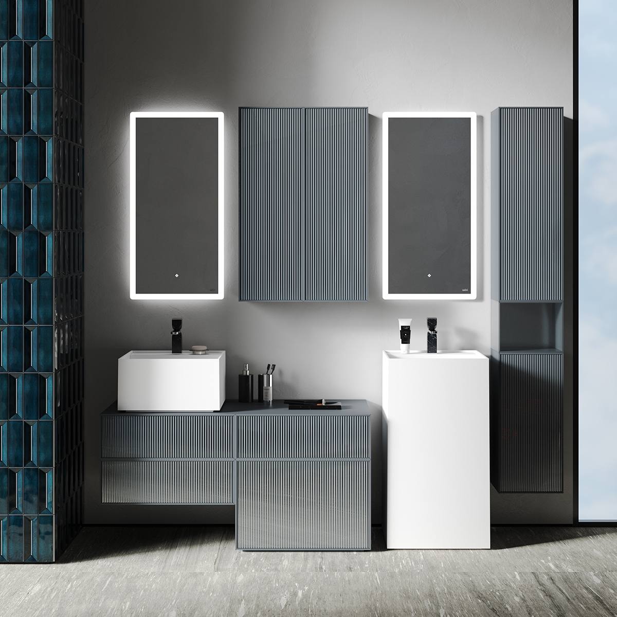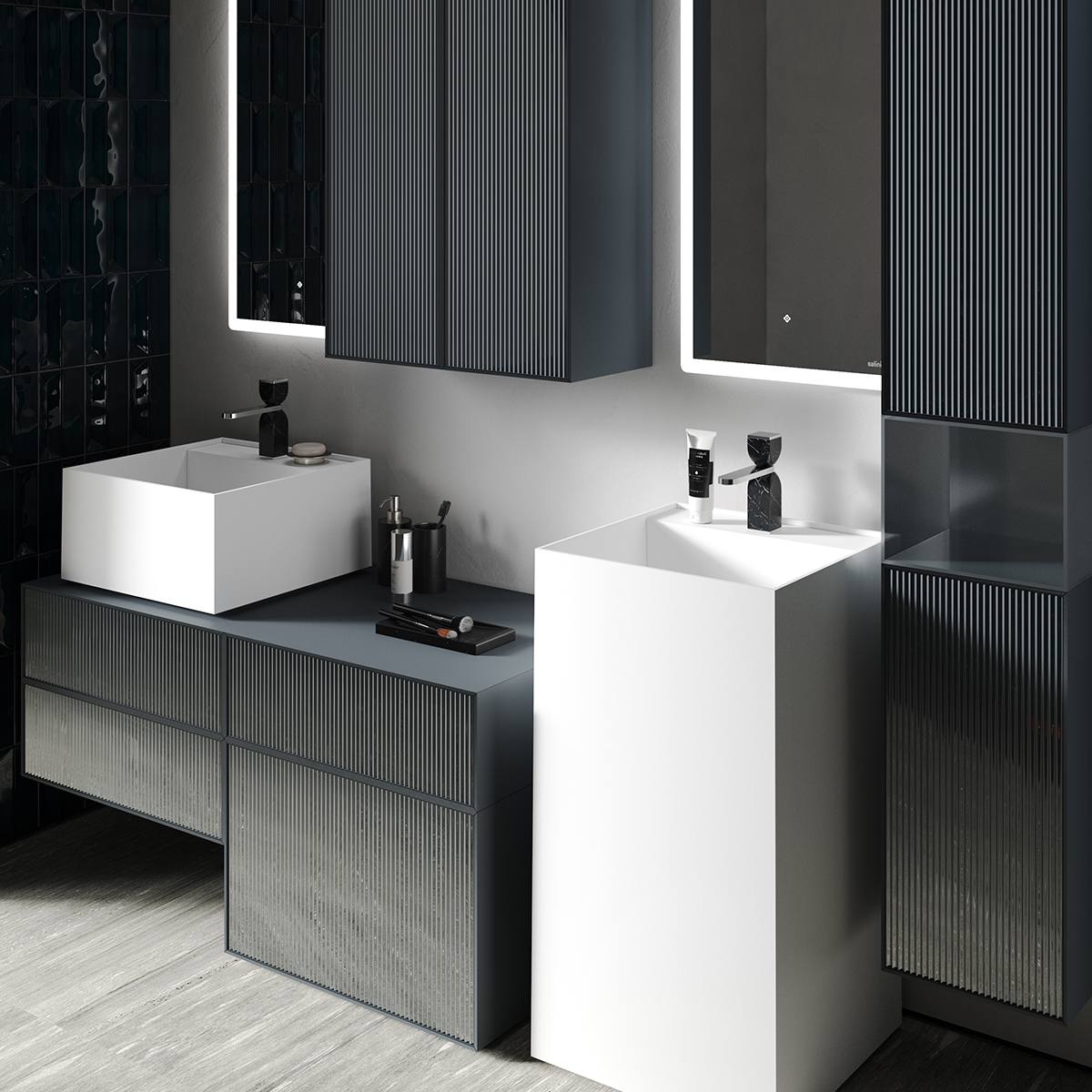 Продуманное комбинирование модулей позволяет создавать как компактные, так и протяжённые композиции мебельных сетов, включающие в себя различные типы раковин, в том числе разной высоты. Широкая вариативность коллекции открывает безграничные варианты для уникального дизайна как компактных, так и просторных ванных комнат.