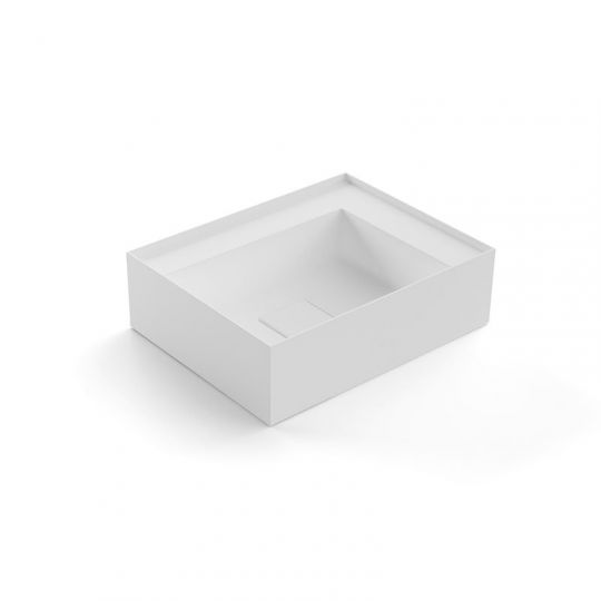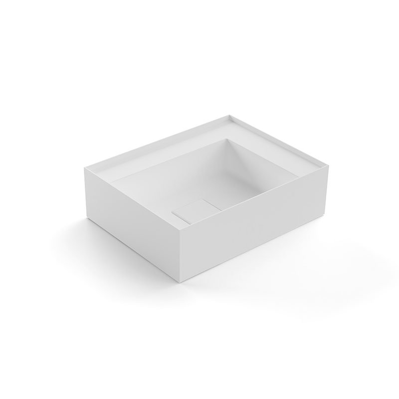 Раковина прямоугольная из материала Flumood или Colormood для установки на столешницу или навесная, в комплекте с самотечным донным клапаном и фитингом для сифона.