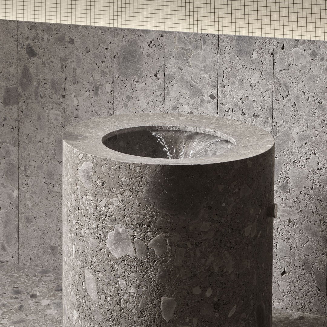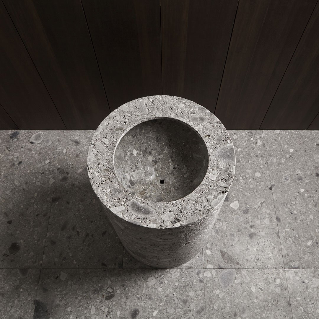 Раковина напольная из камня, со сливом в пол, в комплекте с гидропрогрессивным смесителем (функция каскад), с самотечным донным клапаном и гибким шлангом. Вес раковины: 250 кг.