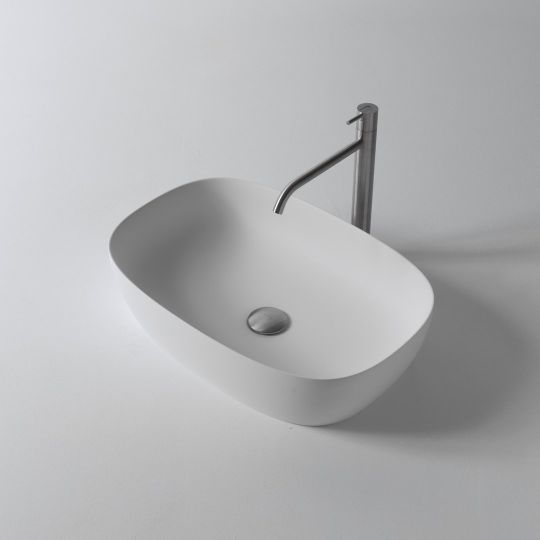 Раковина прямоугольная из камня, для установки на столешницу, в комплекте с самотечным донным клапаном и фитингом для сифона.