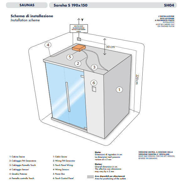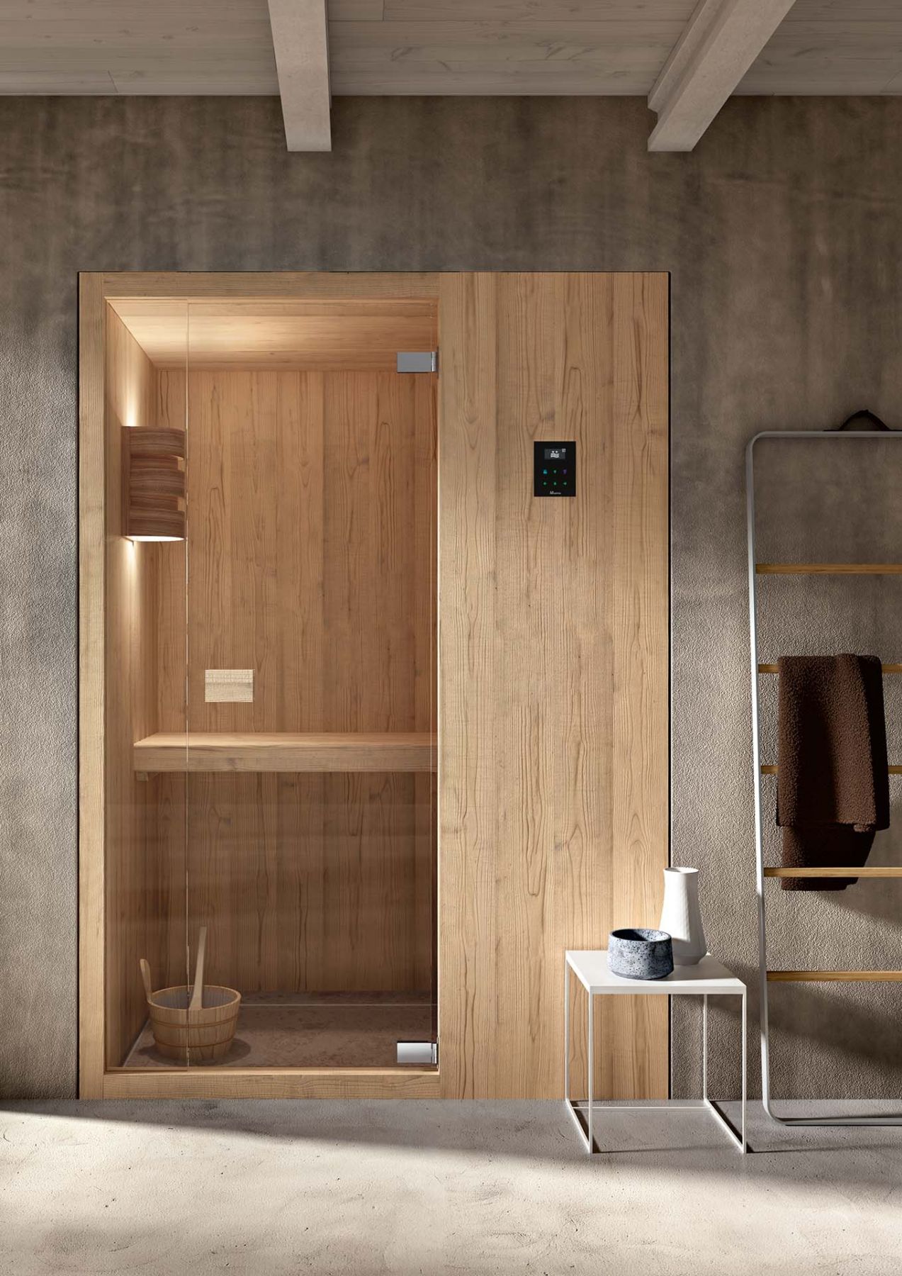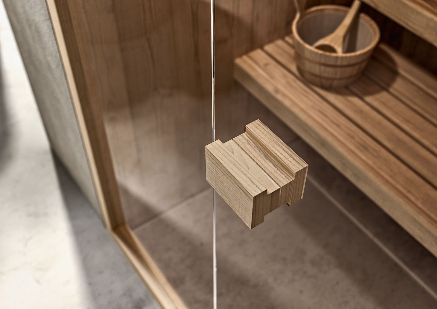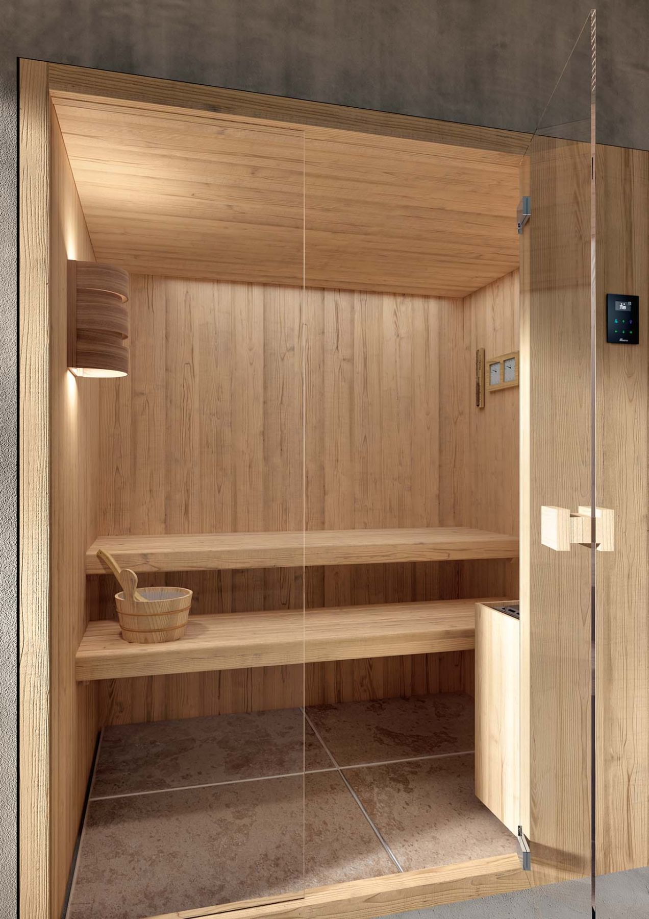 Внутренняя и внешняя отделка из пихты, меламиновые скамейки из дерева Ayous atermico с рейками 82x28 мм, стальная плита с камнем 15 кг, блок управления, петли двери из алюминия анодированный, цвет ручки из натурального дерева Hemlock, стеклянная дверь из закаленного стекла 8 мм, песочные часы из дерева Aspen, ведро из лиственницы с ковшом 50 см из дерева Aspen, подголовник из дерева Aspen, подножка в комплекте