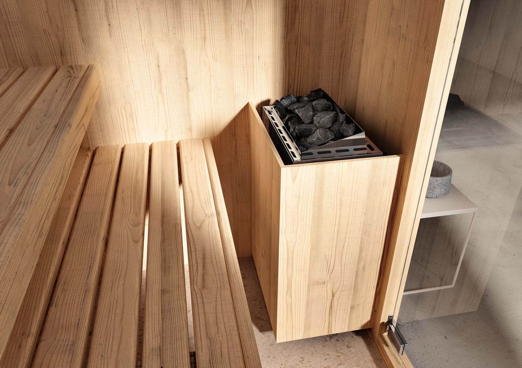 Внутренняя и внешняя отделка из пихты, меламиновые скамейки из дерева Ayous atermico с рейками 82x28 мм, стальная плита с камнем 15 кг, блок управления, петли двери из алюминия анодированный, цвет ручки из натурального дерева Hemlock, стеклянная дверь из закаленного стекла 8 мм, песочные часы из дерева Aspen, ведро из лиственницы с ковшом 50 см из дерева Aspen, подголовник из дерева Aspen, подножка в комплекте