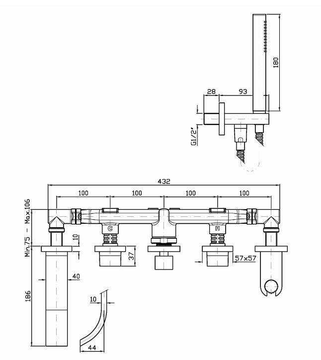 Смеситель для ванны-душа на 5 отверстия встраиваемый, с вытяжным ручным душем Z94177 и шлангом 1500 мм.