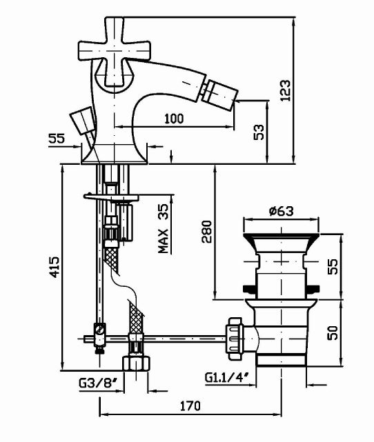 Смеситель для биде на 1 отверстие с аэратором, донным клапаном и гибкой подводкой.