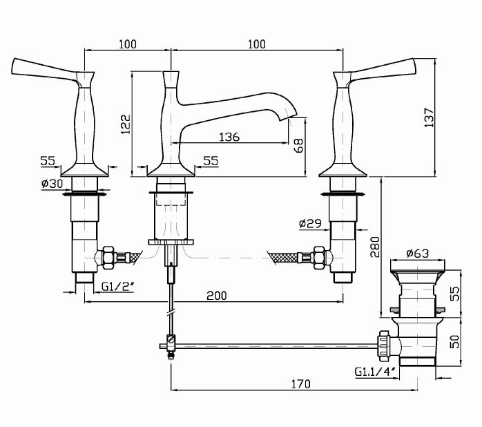 Смеситель для раковины на 3 отверстия с аэратором, донным клапаном на и гибкой подводкой.