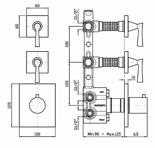 Смеситель для душа термостатический встраиваемый на 1/2 “, с 2 запорными вентилями.