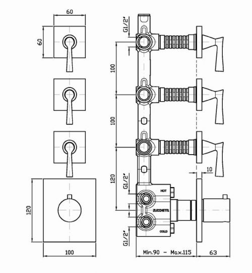 Смеситель для душа термостатический встраиваемый на 1/2 “, с 3 запорными вентилями.