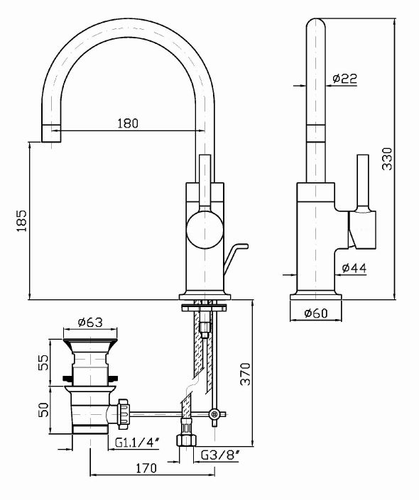 Смеситель для раковины однорычажный с аэратором, донным клапаном и гибкой подводкой.