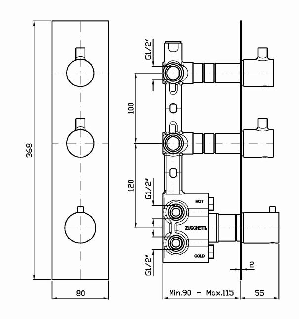 Смеситель для душа термостатический встраиваемый на 1/2 “, с 2 запорными вентилями.