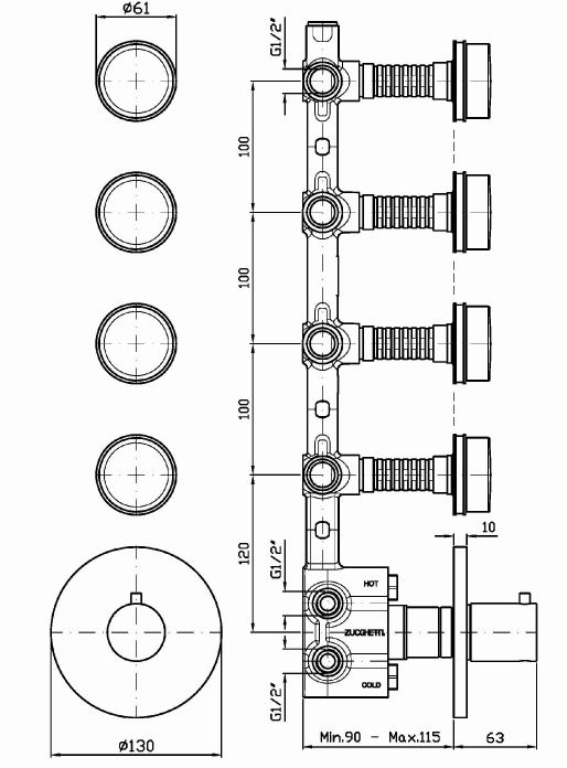 Смеситель для душа термостатический встраиваемый на 1/2” с 4 запорными вентилями.