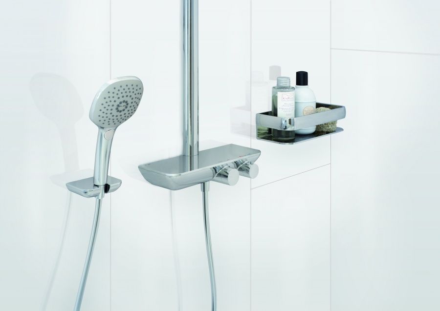 - Инновационная функциональность: верхняя поверхность смесителя позволяет разместить ванные принадлежности, как на удобной полке.